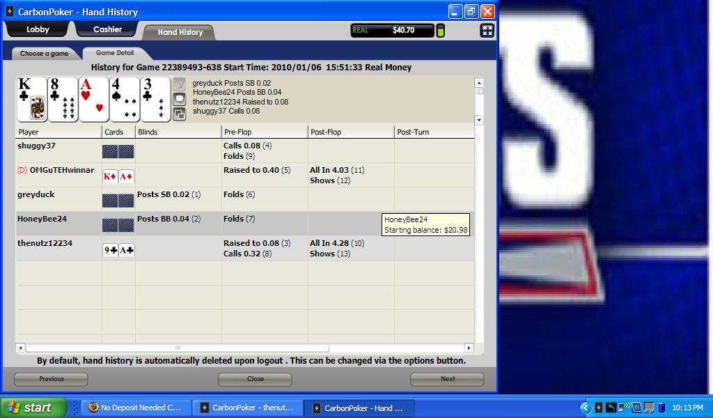 Now basically I am freerolling with the 4 dollar table. Meaning if i lose this hand I can be up a little for the session.