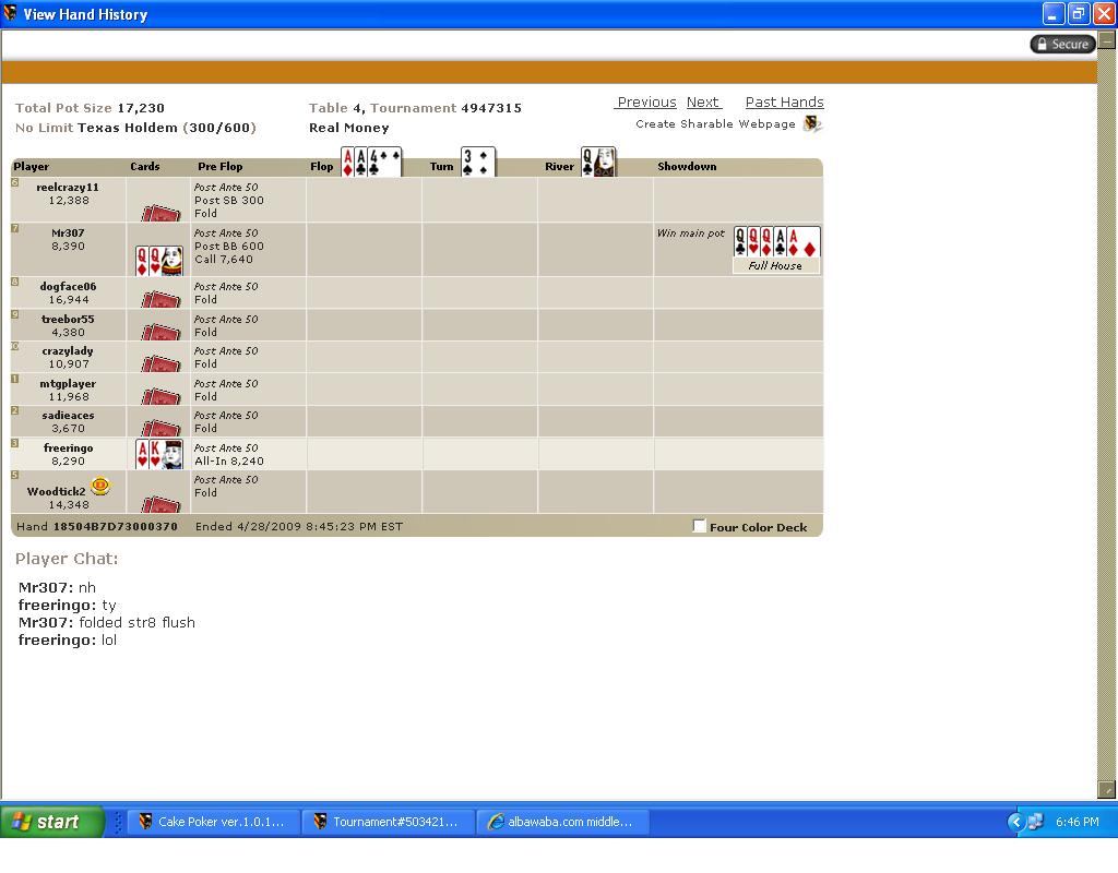 Remember this when looking at the outcome of a hand. If you changed the time of your INITIAL call, you change the outcome of the ENTIRE hand. Most of the large sites have what is called a rotating deck. This means that the remaining cards never stop shuffling. If you change the timing by so much as a 1/2 second you change the entire hand. So, with the current timing giving you the great flop, but the horrible river, there is nothing you can do. If you make a different raise and the other player acts faster than he did in the hand, the flop is different, the turn is different, and the river is different. Just something to consider in the future.